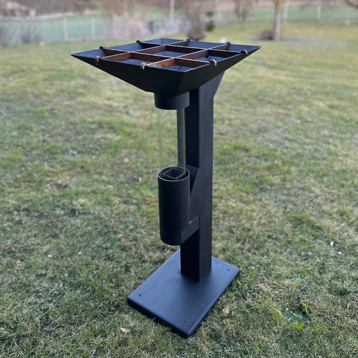 OLAF 500 Hier wird schön geheizt! Die offene Feuerschale kann wahlweile als Griller mit Rost oder als Feuerschale genutzt werden. Die Halbkugel mit dem Unterteil für die Holzlagerung kann wahlweile gerade oder schräg gestellt werden. Das Feuer orientiert sich zum Sitzplatz.